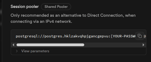 Usaremos session pooler debido a restricciones de IPV4 en el plan free.