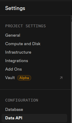 Para obtener los datos de la API, vamos a ver la configuracion del proyecto y ubicamos la opción Data API.
