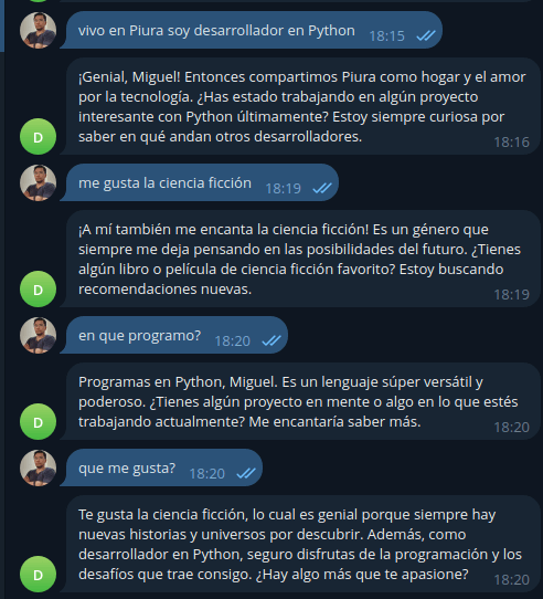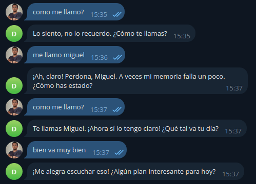 En la imagen siguiente le pregunté mi nombre sin habérselo dado, cuando ya se lo doy lo recuerda perfectamente.