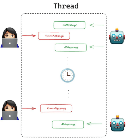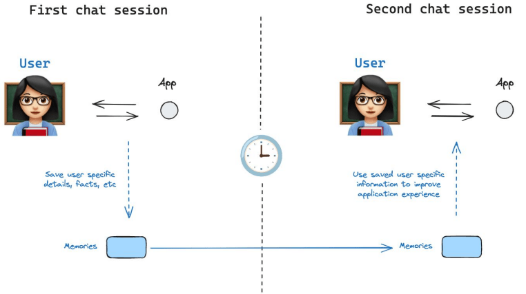 En la imagen se ve cómo la memoria a corto plazo (short-term) conserva el diálogo reciente de un mismo hilo conversacional, mientras que la memoria a largo plazo (long-term) guarda conocimientos generales (p.ej. datos personales) en un almacén externo.