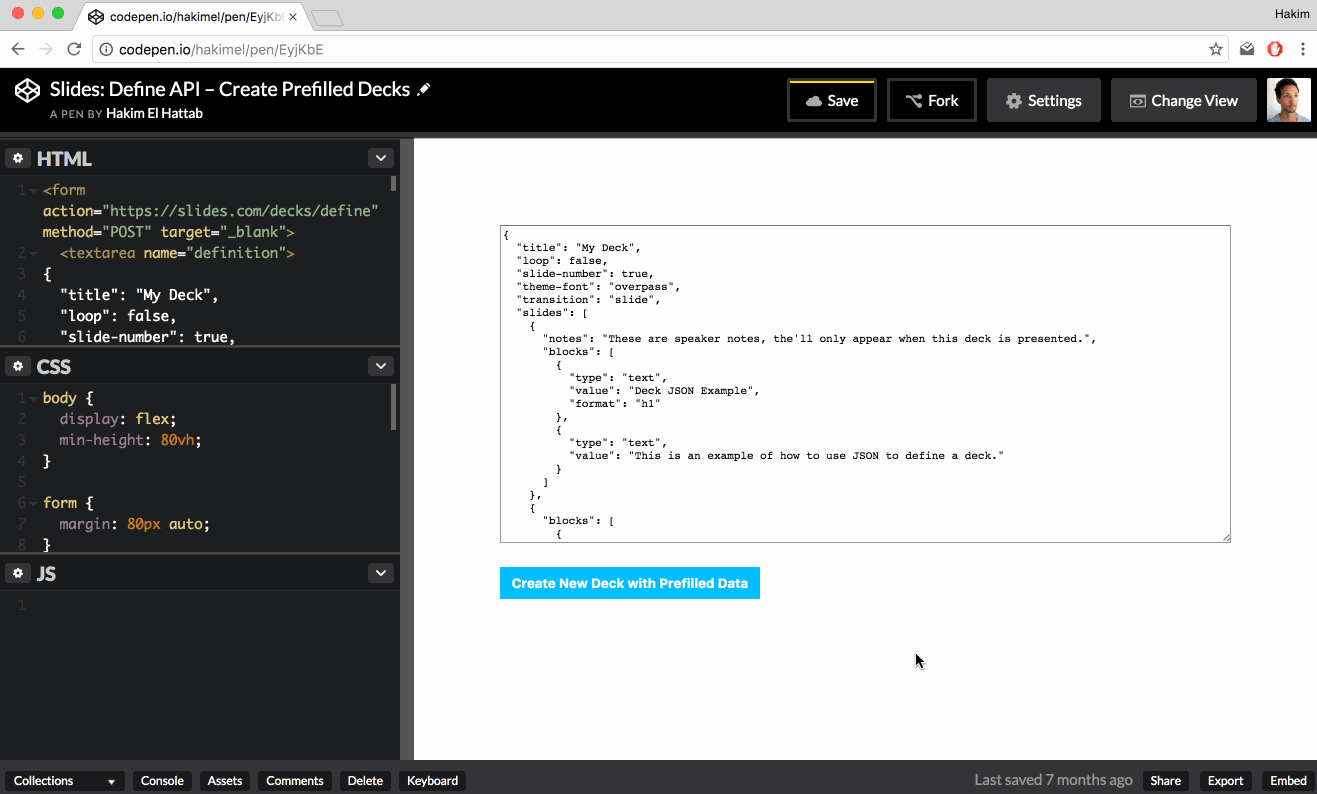 To start the process you'll need to have the user submit an HTML form towards the http://slides.com/decks/define endpoint. The form needs to contain an input field with the name definition and the value of this input should be the JSON representation of a deck. Once the form is submitted, we'll automatically redirect the user to the appropriate page.