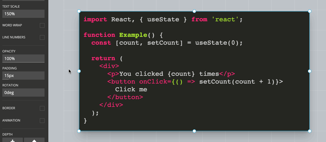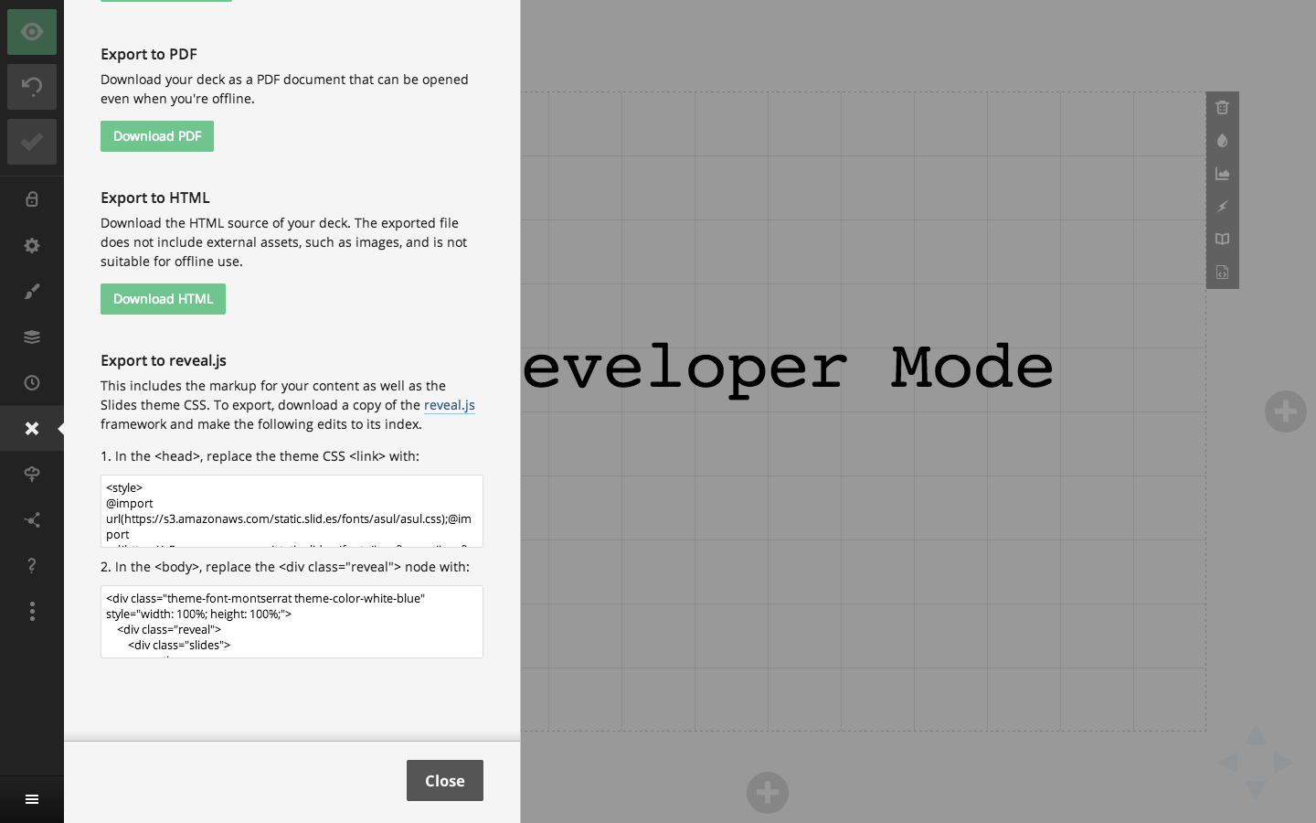 We strive to make Slides a great and flexible tool for developers. Presentations created on Slides are HTML documents under the hood, so generally anything that HTML can do, Slides can do. We make it easy to access and edit the underlying HTML and CSS through the Developer Mode.