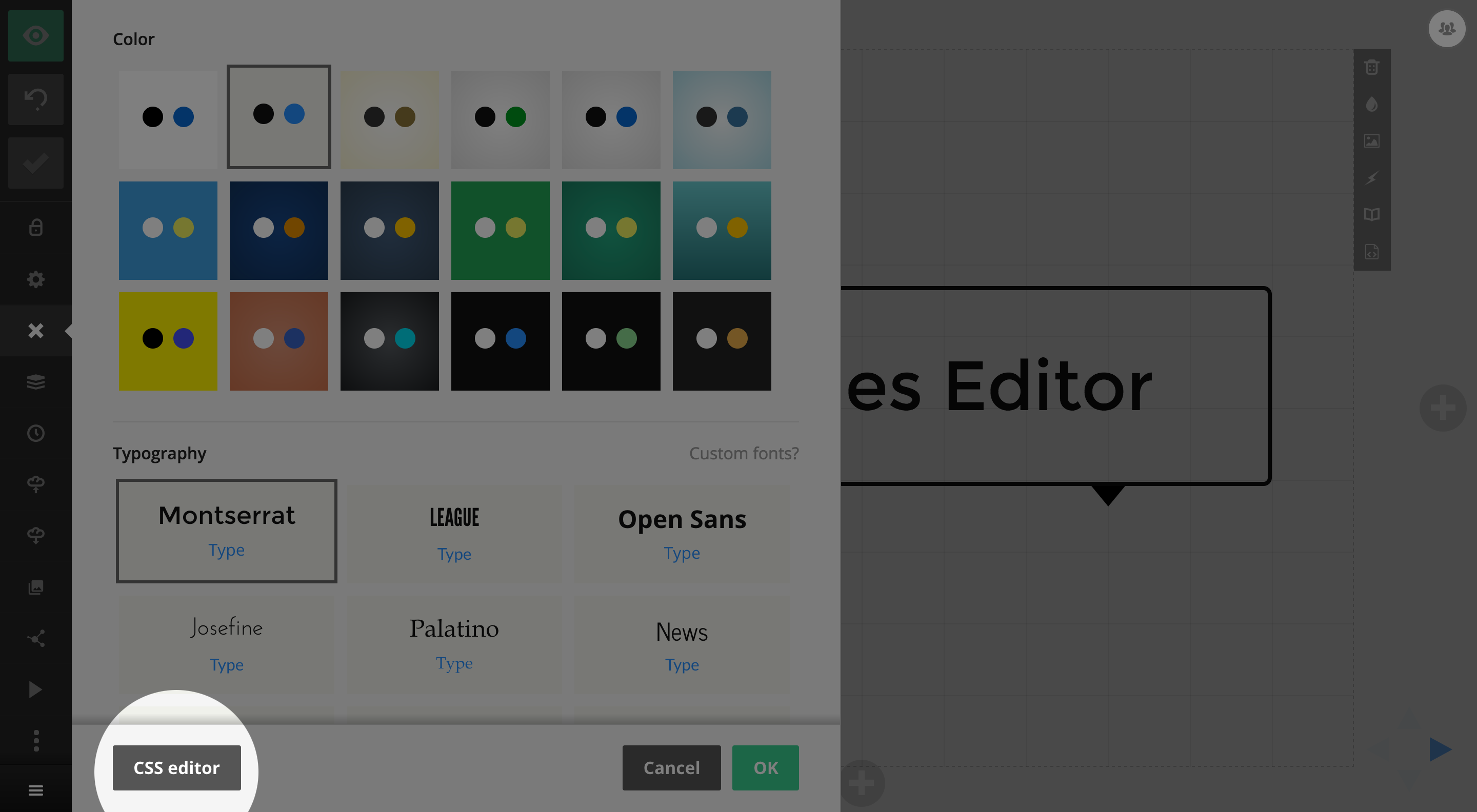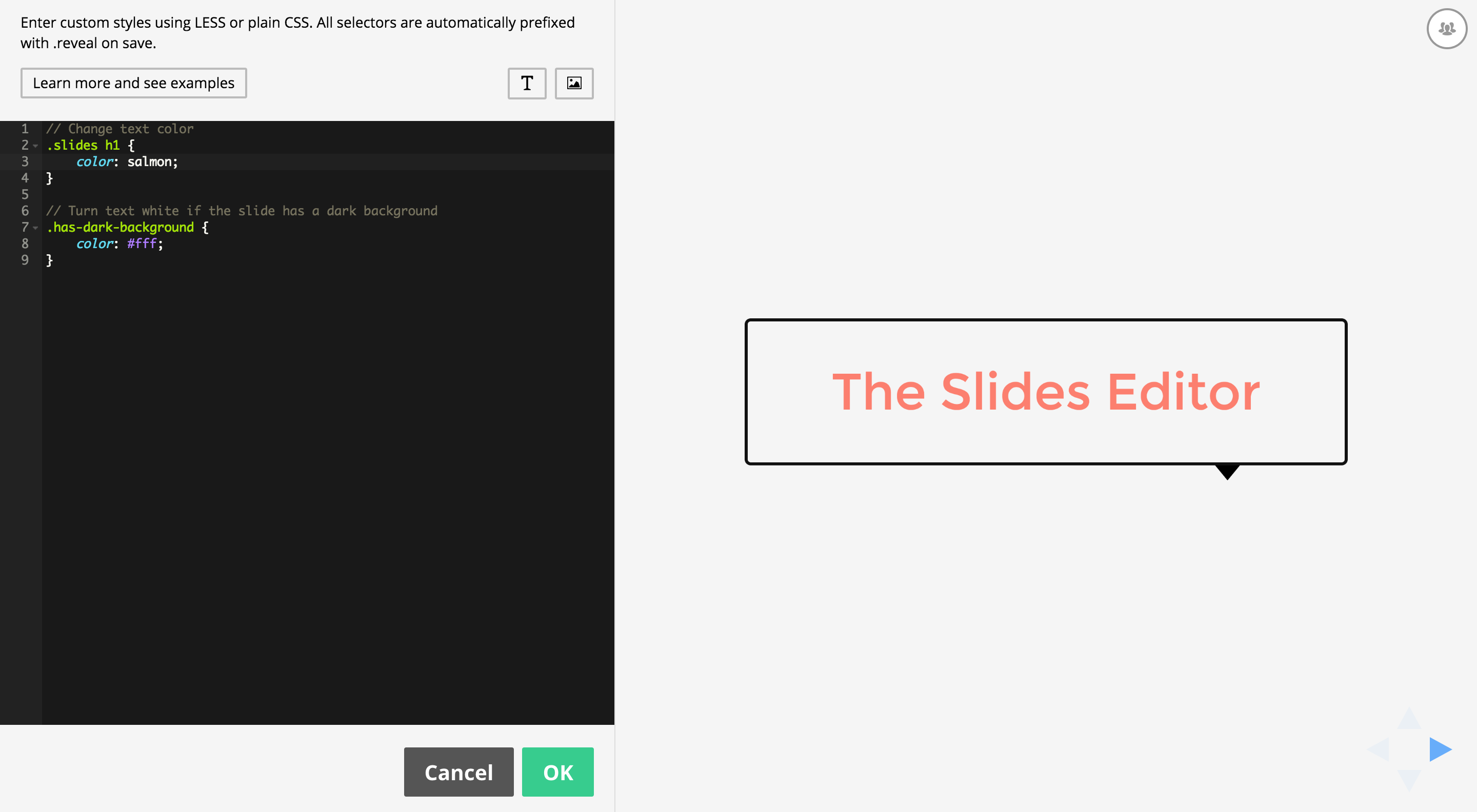 The CSS editor lets you author custom styles for your presentation with a real-time preview of the result. It's available as an option inside of the Style panel of the presentation editor.