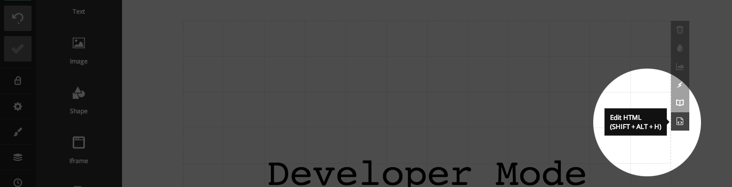 The per-slide HTML editor can be accessed from the slide options area. It gives you raw access to the current slide's HTML, allowing you to change anything you like. Note that some elements, such as <script> and <link>, are not allowed for security reasons.