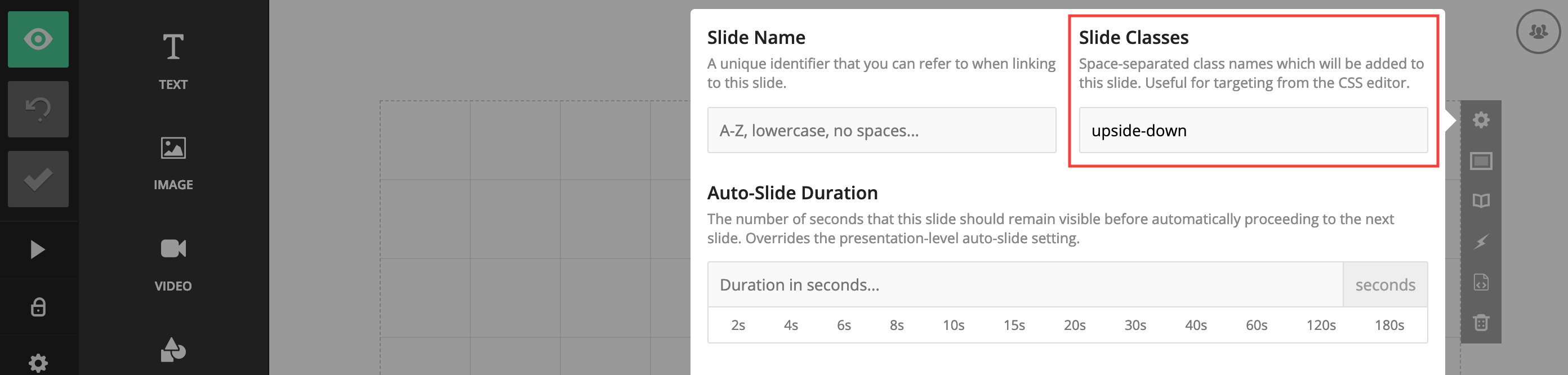 Just like you can add custom classes to individual elements it's also possible to add custom classes at the slide level. This can used to apply broader changes to the whole slide like inverting text and icon colors or changing the slide transition.