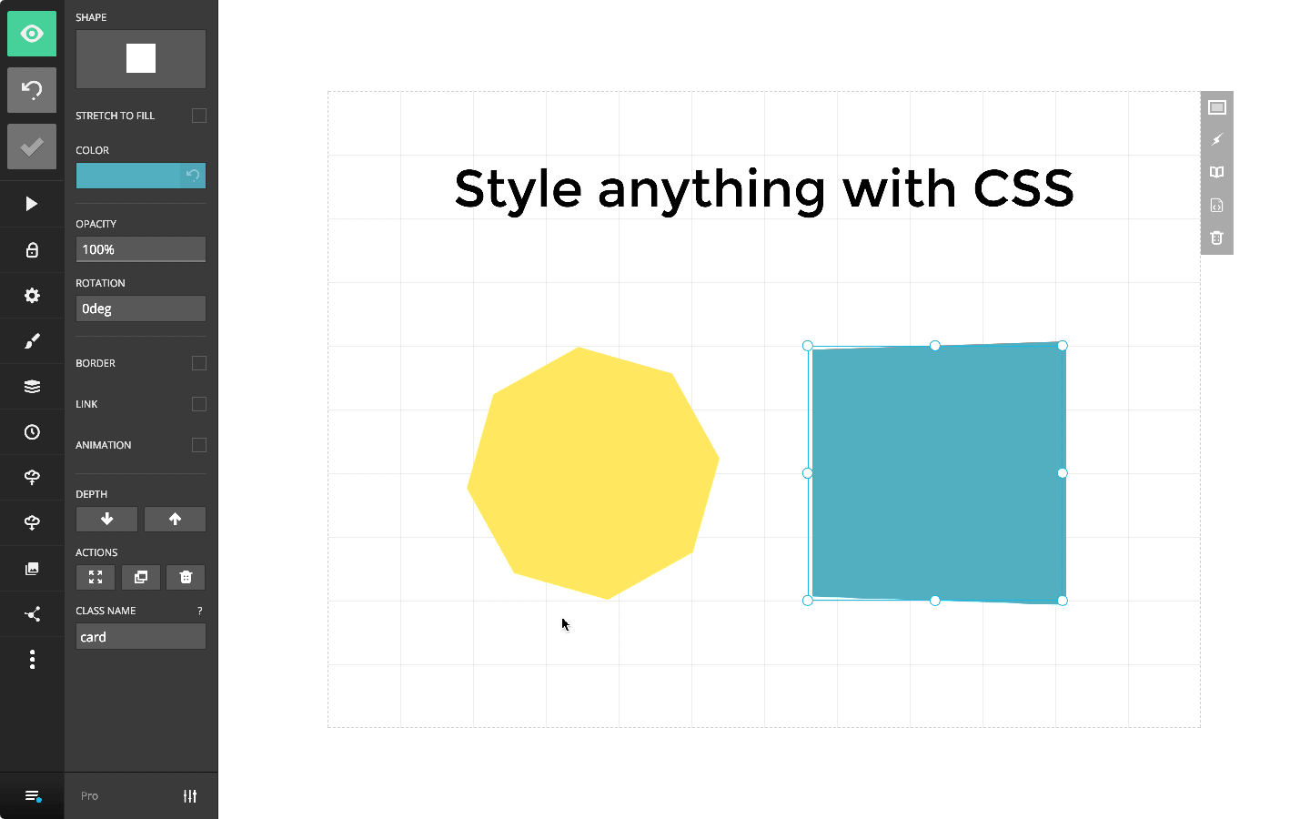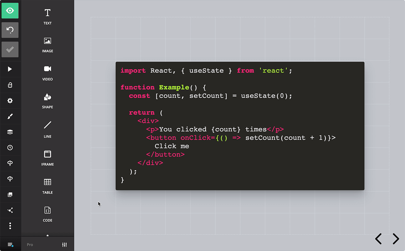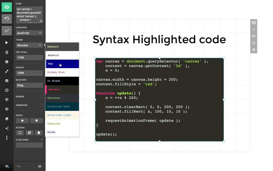 Take advantage of the power of HTML & CSS directly within the editor. Apply custom styles and animations to text, SVGs, images and more to give your presentation an unmatched look and feel.