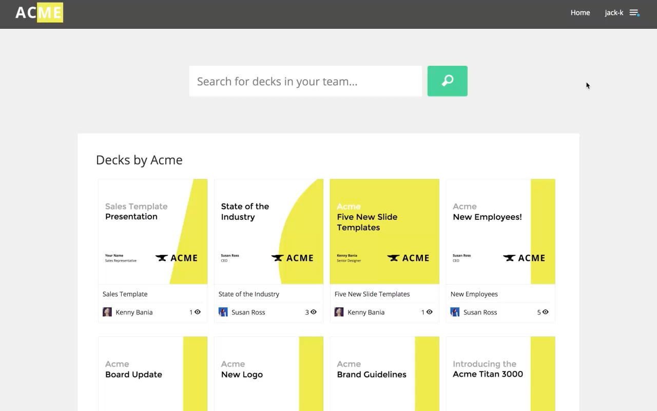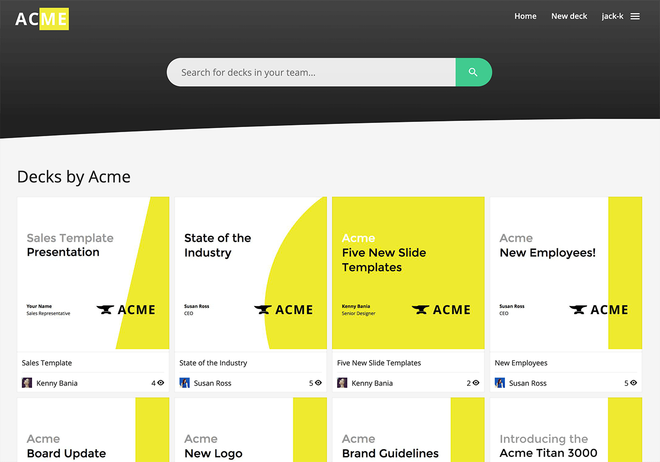 Your team lives on its own subdomain where Slides branding is replaced with your own. This is your team’s go-to location for all of their presentation needs.