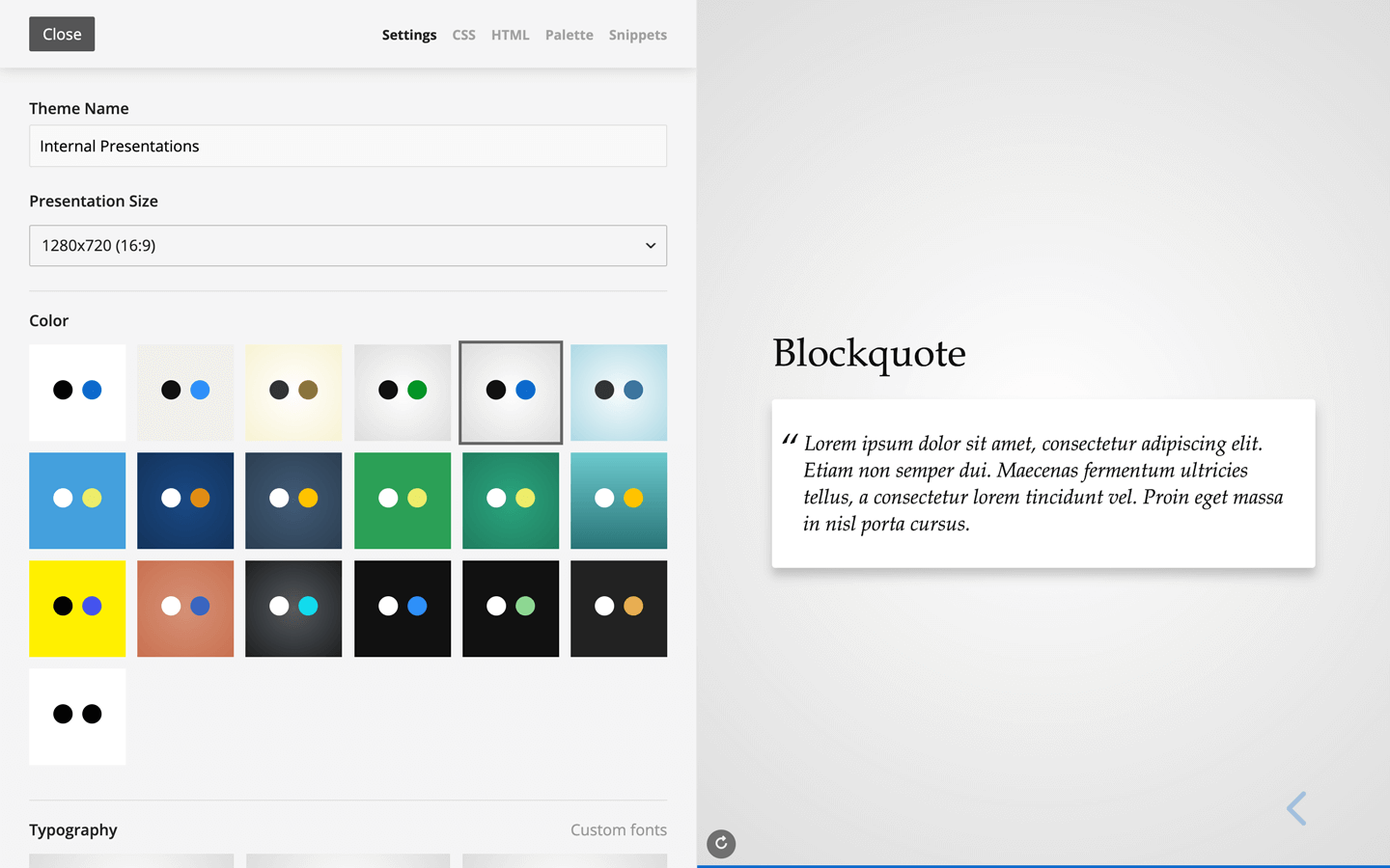 The Theme Editor lets you create fully customized presentation themes for your team. Changes made to an existing theme automatically apply to all existing decks.