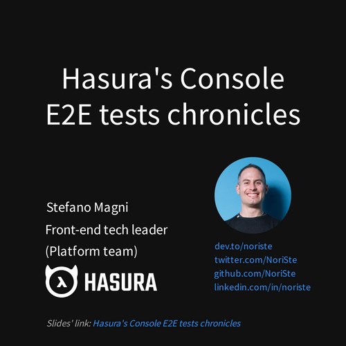 I joined Hasura in May 2022, and one of my first tasks was to fix the E2E tests of the Hasura Console, main Hasura's front-end application. The main problems were: they were slow, and they were flaky. Then, by digging into the topic, there was more to say, more to decide, more to fix, and more to do. This presentation is about what we found out, the problems, the best practices, etc.