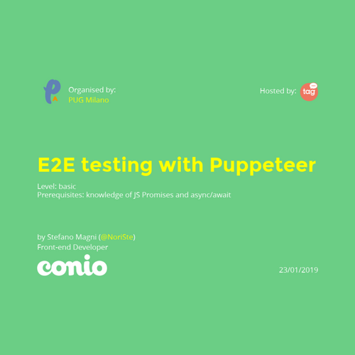 July 2019, first Working Software conference (https://www.agilemovement.it/workingsoftware) --- Title: Mastering UI testing --- Abstract: Writing UI tests for the web is hard, a lot of times the tests are brittle and unmaintainable. You must run them multiple times and, sometime, you need to exclude some of them from your pipeline. I'm going to explain to you the most important best practices that allow you to master the UI tests hell. I'm going to show you how much a tool like Cypress can help you writing and maintaining your UI tests.